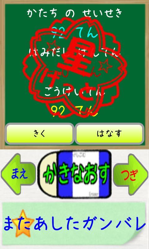 这个应用程序是训练的应用程序编写的“平假名”?你可以选择画笔的颜色。声音开 - 关,如果这是声音关闭,您不能使用TTS和语音的认可。