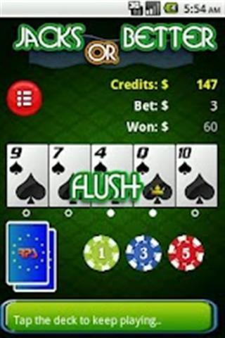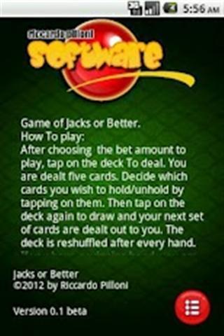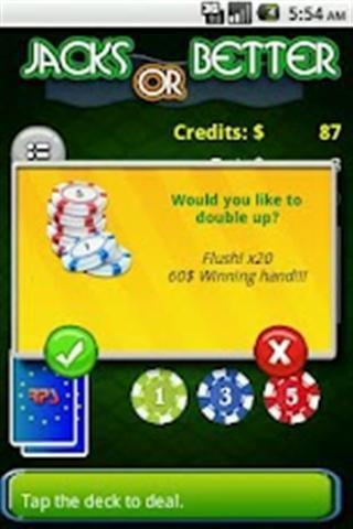 选择的投注金额后,点击在甲板上要处理。您发五张牌。决定你想保持/恢复通话的窃听他们的卡。接着点选在甲板上再次提请你的下一个套牌处理给你。每手改组后的甲板。如果你有一个成功的手,你支付的基础上所产生的扑克手的排名,你现在可以选择领取您的奖金或加倍(通过使宝洁选项),。如果你接受的话,经销商选择五张牌的甲板上,其中一张卡面朝上,其余四面朝下。的第一张卡片给经销商,从四个隐蔽的卡,你必须选择一个卡。如果你的卡是提出了更高的价值比庄家的收集,你赢了,你原有的奖金的两倍。但是,如果庄家的牌打你,或在出现平局的情况下,你失去了你的手的奖金。语言支持:英语,意大利语和罗马尼亚语。
