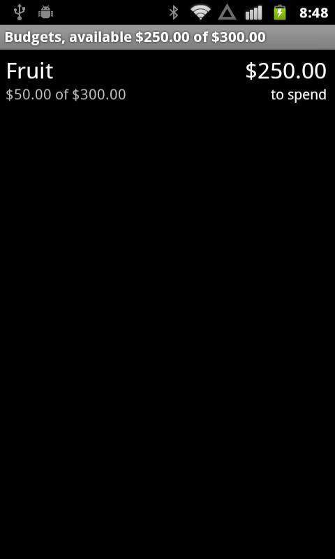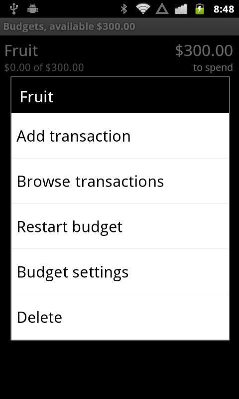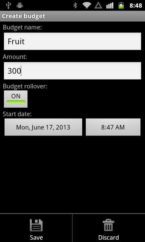 It is time to make a budget for you and your money. Manage your money well and then you could be richer than before. Start with this free application!FunctionsShow budgets name and balance for each budgetIn the main interface of this app, you will find your budgets which have saved here, and its balance is listed in the right side of this budget. Add & Browser transactionLong press the budget to find some further operations, including add transactions and browser transactions.Add transaction, three kinds of information requires you to input, they are amount, name and date. Then press the menu button to save it. So that you can track on the money when and how you have spentRestart and resetting budgetThese two functions are under add transaction and browser transaction, they are named as restart budget and budget setting.It will count the balance when you restart the budget. For instance, you set a budget of 300 dollars for office lunch, and the balance of today is 240. It will become 540 when you restart it.Budget setting, click this section to open it and change the information of this budget, such as budget name and amount.How to create a budget in this app?Press the menu button to add new budget in the main user interfaceEnter into the budget name and amount. For example, budget name: meal; amount: 300.Click to turn on and off budget rolloverSet the start date for this budget. It displays the current time, but you can change it by pressing the buttons here.Press the menu button and click save, then you will see this budget in the main user interface, with its balance and some other information.Long press the existing budgets to manage them.--------------------------------------1. This is a FREE app.2. Please give this app some support if you like it. You can contact us though email.--------------------------------------Budget is a quantitative expression of a plan which for a defined period of time. A budget may include planned sales volumes and revenues, resource quantities, costs and expenses, assets, liabilities and cash flows.