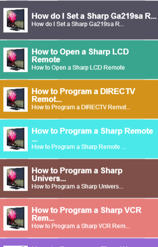 Sharp Remote GuideIn this App you can see this topic.1. How do I Set a Sharp Ga219sa Remote2. How to Open a Sharp LCD Remote3. How to Program a DIRECTV Remote Control to a Sharp TV4. How to Program a Sharp Remote to Control a Dish Network Satellite5. How to Program a Sharp Universal Remote G1326SA10. Sharp Universal Remote Instructions And you can see the Video and Gamekeyword : Sharp Remote Guide