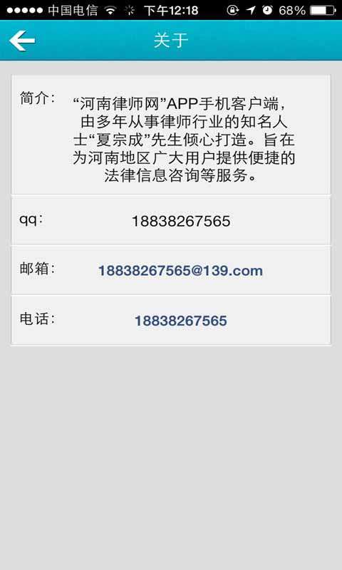 “河南律师网”APP手机客户端,由多年从事律师行业的知名人士“夏宗成”先生倾心打造。旨在为河南地区广大用户提供便捷的法律信息咨询等服务。