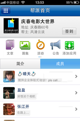 一个基于各种真实团体、企业、帮派、机构、沙龙、圈子、社群、协会、俱乐部等真实组织,并为他们提供即时通讯、位置服务、价值分享、人员管理等移动技术,结合线下互动的社交网络平台。