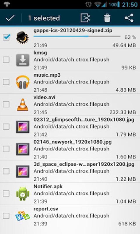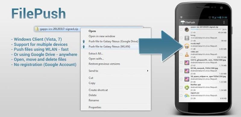 把电脑上的文件传到你的安卓设备上已不再那么复杂,只需两次点击! 这款软件只适用于Windows的用户(Vista/win7)。 你也可以在http://ctrox.ch/filepush上下载客户端。 有了windows客户端,当你点击资源管理器里的文件时,可以出现一个一个目录菜单条“传送文件到(你的手机)”。点击之后,只需几秒的时间,文件就会出现在你的设备上。 当然,还是建议用WLAN.