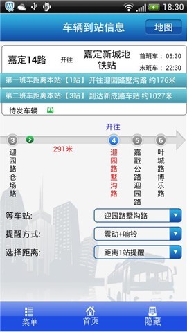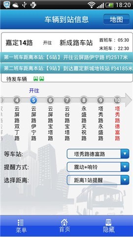 本软件支持公交实时查询,换乘查询:查询两个站点之间的行车信息,系统自动给出行车方案,选择线路后可进入行车监控界面。站点名称输入支持检索功能,系统自动匹配相关站点。 线路查询:查询线路所经过的站点信息,选择站点后可进入车辆实时到站信息界面。 站点查询:查询所有经过此站点的线路信息,选择线路后可进入车辆实时到站信息界面。站点名称输入支持检索功能,系统自动匹配相关站点。 地图选站:地图自动显示线路站点信息,选择站点后显示经过线路信息,选择线路可以进入车辆实时到站信息界面。 附近公交:公交查询。如输入”嘉定14路“点此按钮后,地图上自动成线形图示。方便查看公交走向及经过站点。 搜索按钮:可搜索车站,餐厅等地点信息。