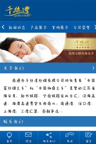 南通千丝湾丝绸有限公司官网APP,本款APP主要以企业介绍、产品介绍、业界新闻为主,有在线分享功能,用户可从中了解本公司经营的产品、公司的概况。