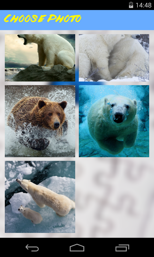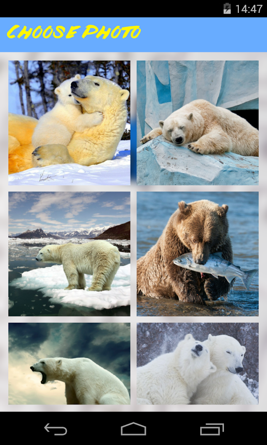 Bear Jigsaw Puzzle is a simple and beautiful free jigsaw puzzle game for all ages. Jigsaw Puzzles provide hours of entertainment for whole family from kids to adults.Train your brain, memory, imagination and creativity.Amazing collection of jigsaw puzzles with Bears.Solve your favorite jigsaw puzzles and become the best player!
