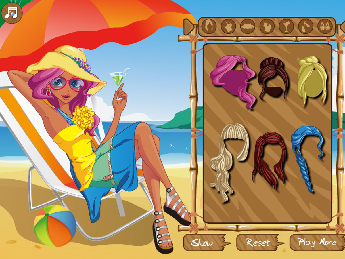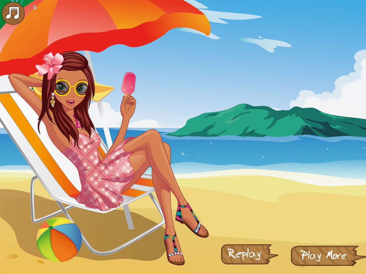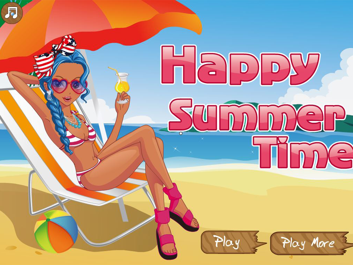 The Happy Summer Time game gives you plenty of fun in the sun with these fun dress up games. This summer game allows you to mix and match different items to create a great outfit for your character for her holiday in the sun. This summer dress up game features 11 small circle icons at the top of the right hand side of the screen which represent hair, top, skirt, dress, drink, shoes, earrings, necklaces, sunglasses, swimwear and hats. The two arrows at each end of the circles allow you to scroll through each item to choose what you want to dress your character with. To play you can click on each item and watch below in the large brown square as your options appear on the screen. To choose each item simply click on the picture. Once you have found the right outfit you then press the "show" button at the bottom of the screen to see your character on her holiday. To replay simply press the "replay" button to replay the game over again.