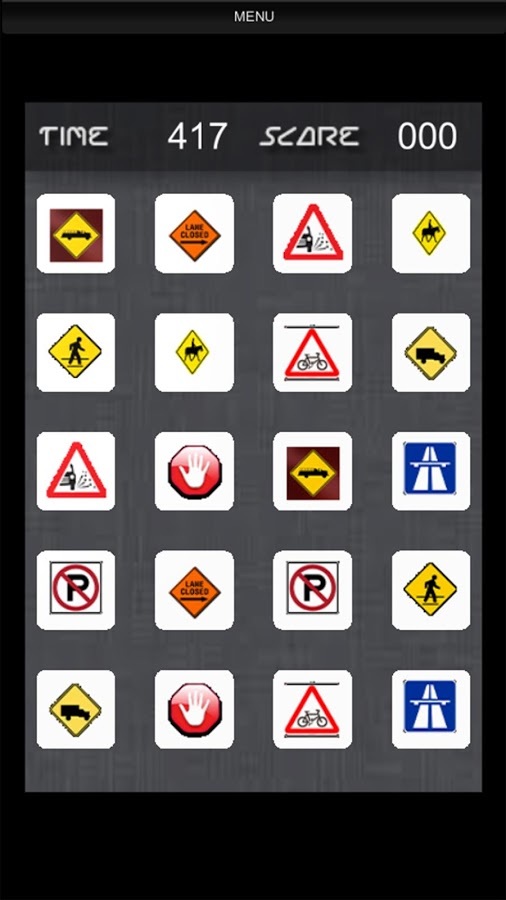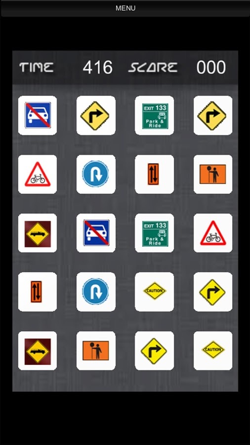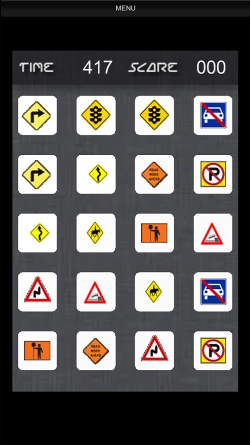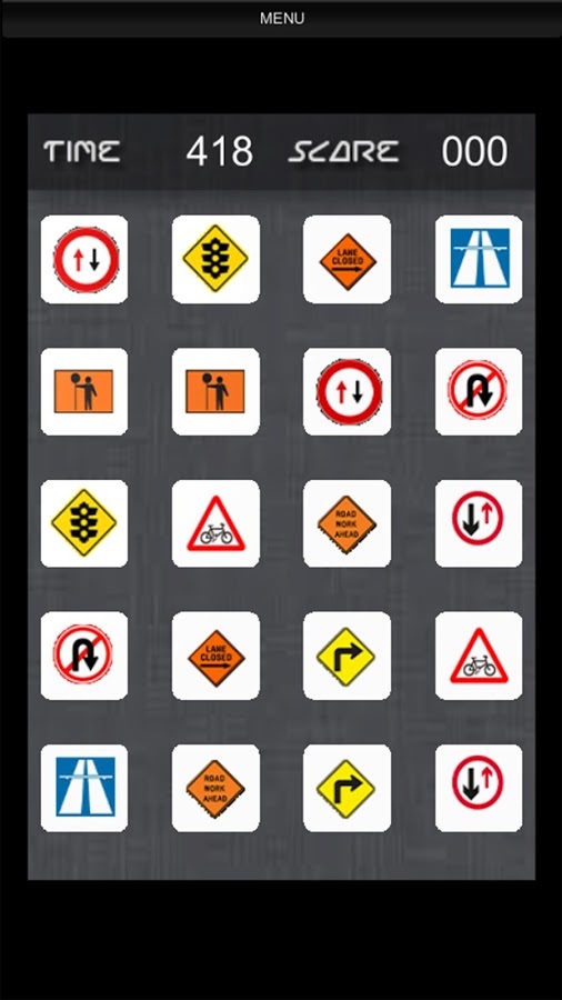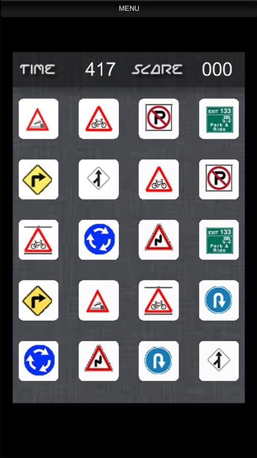 Road Signs for Gray Matter is specially designed game to improve your mind capabilities by making you remember location of road sign in matrix of cards...Many of us would have given road sign test in order to pass for driving license. In such tests we learn meaning of traffic signs, but this game is not about that... Road Signs for Gray Matter is about developing your memory sharpness by asking you to do solid observation of signs available in matrix. These cards have all signs repeated one time, so when you open a sign, you need to match that by opening only such time in next click, If you can successfully open same sign in two successive clicks - those cards vanish and you get points. This way you build up score and score depends on how much time you take to recognize location of road signs. Faster you do, more points you get. So get ready now... because driving signs are waiting for you :-) Jump in...BRAINY FEATURES★ 16 Fun Packed Levels★ Awesome Graphics★ Soothing Audio FX★ Cards Matching Animations★ Game Play to Improve Mind FitnessSOCIAL HANDLESBecome a fan of Binary Thinkers on Facebook to get Wallpaper, Ringtone, Songs, Videos, Free Trailers, Digital Gifts and Other Games for FREE:http://www.facebook.com/BinaryThinkersFollow us on Google+:http://www.google.com/+BinaryThinkersFollow us on Twitter:http://www.twitter.com/BinaryThinkersEnjoy our YouTube video channel:http://www.youtube.com/BinaryThinkersVisit our website:http://www.BinaryThinkers.com